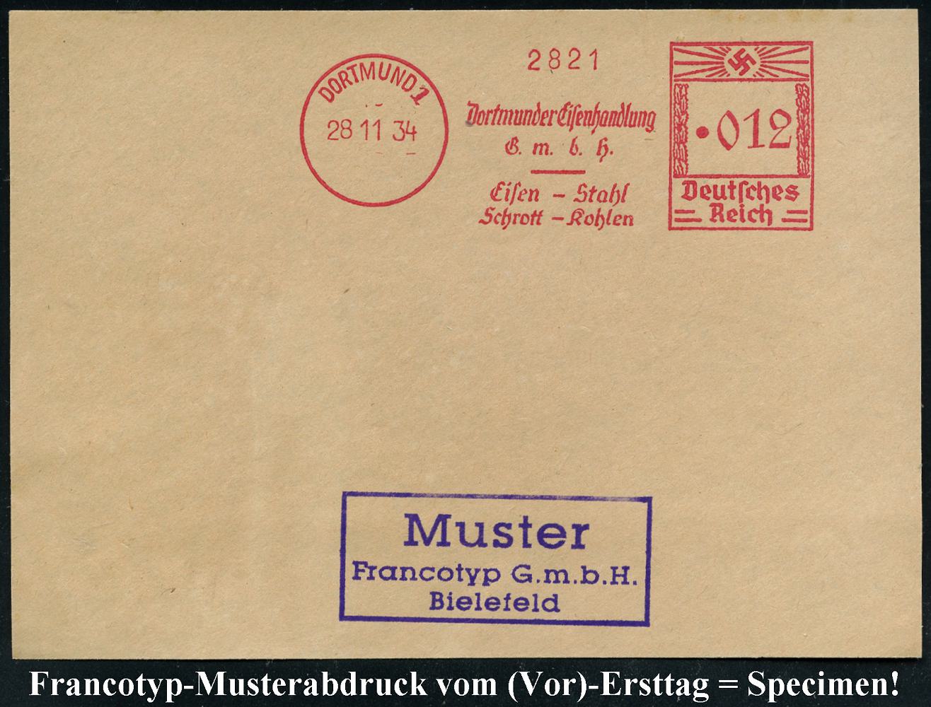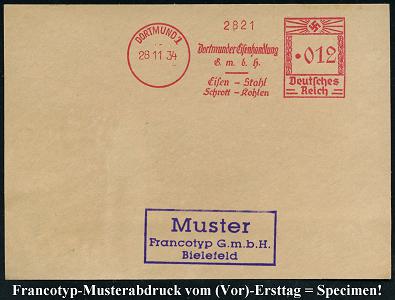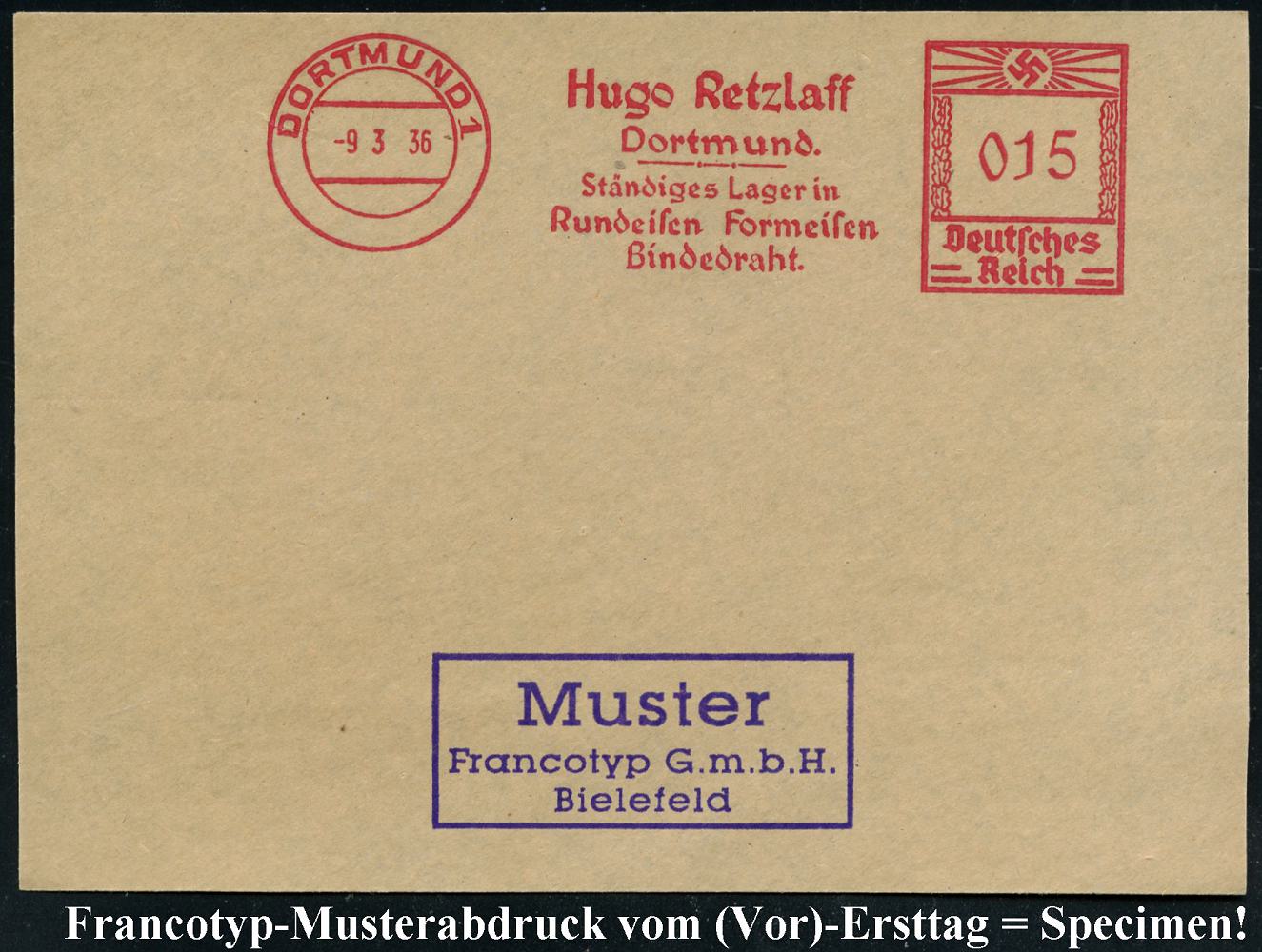 8008 | 35 € | 4600 Dortmund Absender-Freistempel : DORTMUND 1/ Hugo Retzlaff/ ..Ständisches Lager in/ Rundeisen,Formeisen/ Bindestahl 1936 (9.3.) AFS Francotyp "Hakenkreuz" , glasklar gest. Francotyp-Musterblatt vom (Vor)-Ersttag !, selten! (Dü.E-3CEo) | ![]() ![]() | |
