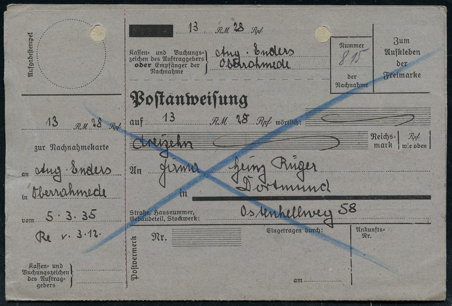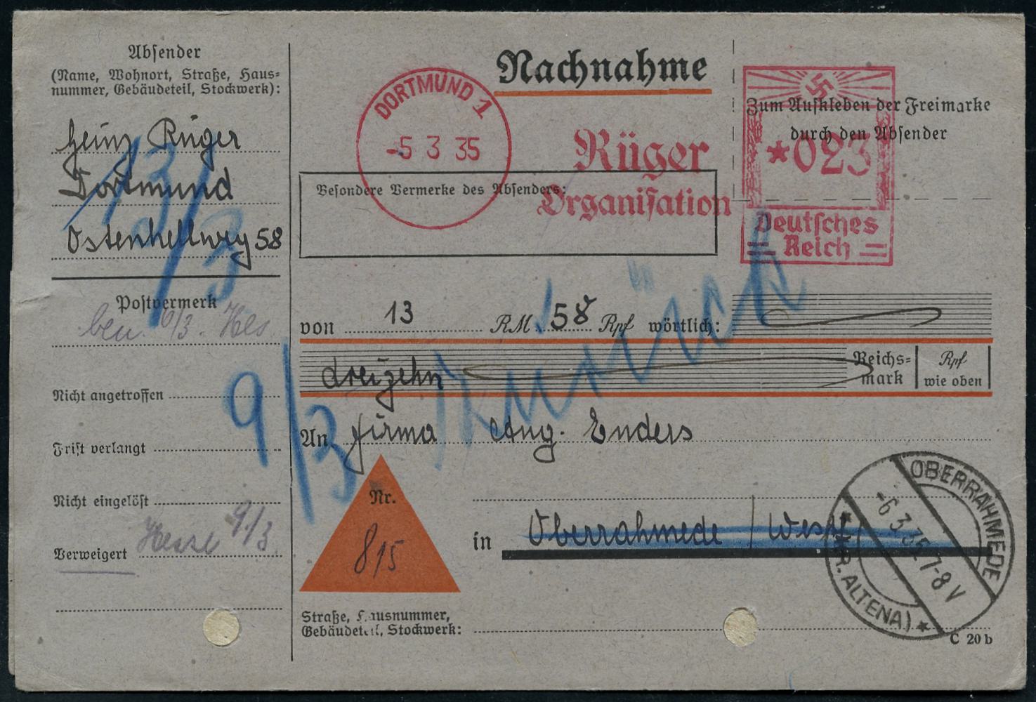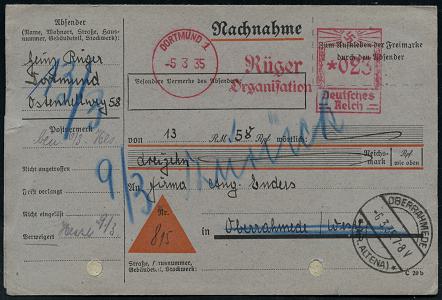 8005 | 18 € | 4600 Dortmund Absender-Freistempel : DORTMUND 1/ Rüger/ Organisation 1935 (5.3.) AFS Francotyp "Hakenkreuz" *023 (Pf.) klar gest. Retour-NN-Kt. + anhängender Zahlkarte (Reg.-Lochung u. kl. Rißchen geschl.) n. Oberrahmede, vs. AS., seltene Portostufe (Dü.E-3Ao) | ![]() ![]() | |