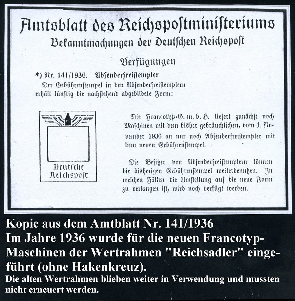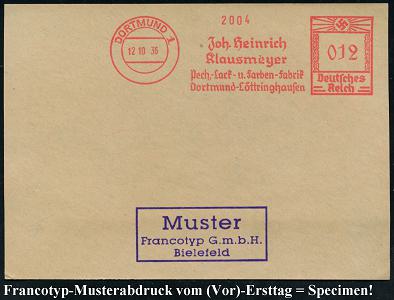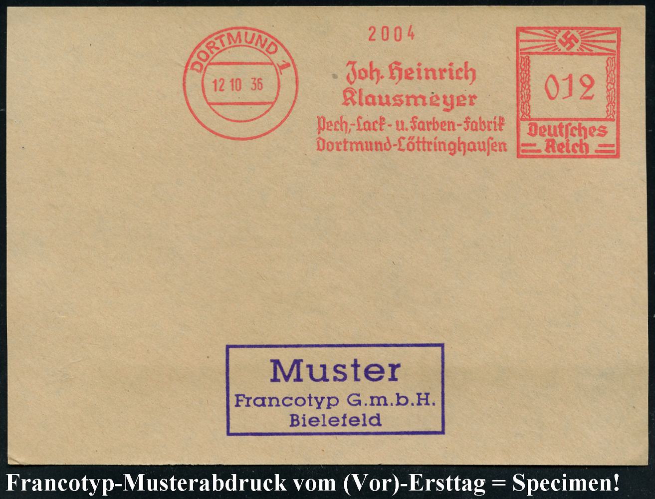 8010 | 35 € | 4600 Dortmund Absender-Freistempel : DORTMUND 1/ Joh.Heinrich/ Klausmeyer/ Pech-,Lack-u.Farben-Fabrik/ Dortmund-Löttringhausen 1936 (12.10.) AFS-Musterabdruck Francotyp "Hakenkreuz" , glasklar gest. Francotyp-Musterblatt vom (Vor)-Ersttag !, selten! (Dü.E-3CEh) | ![]() ![]() | |