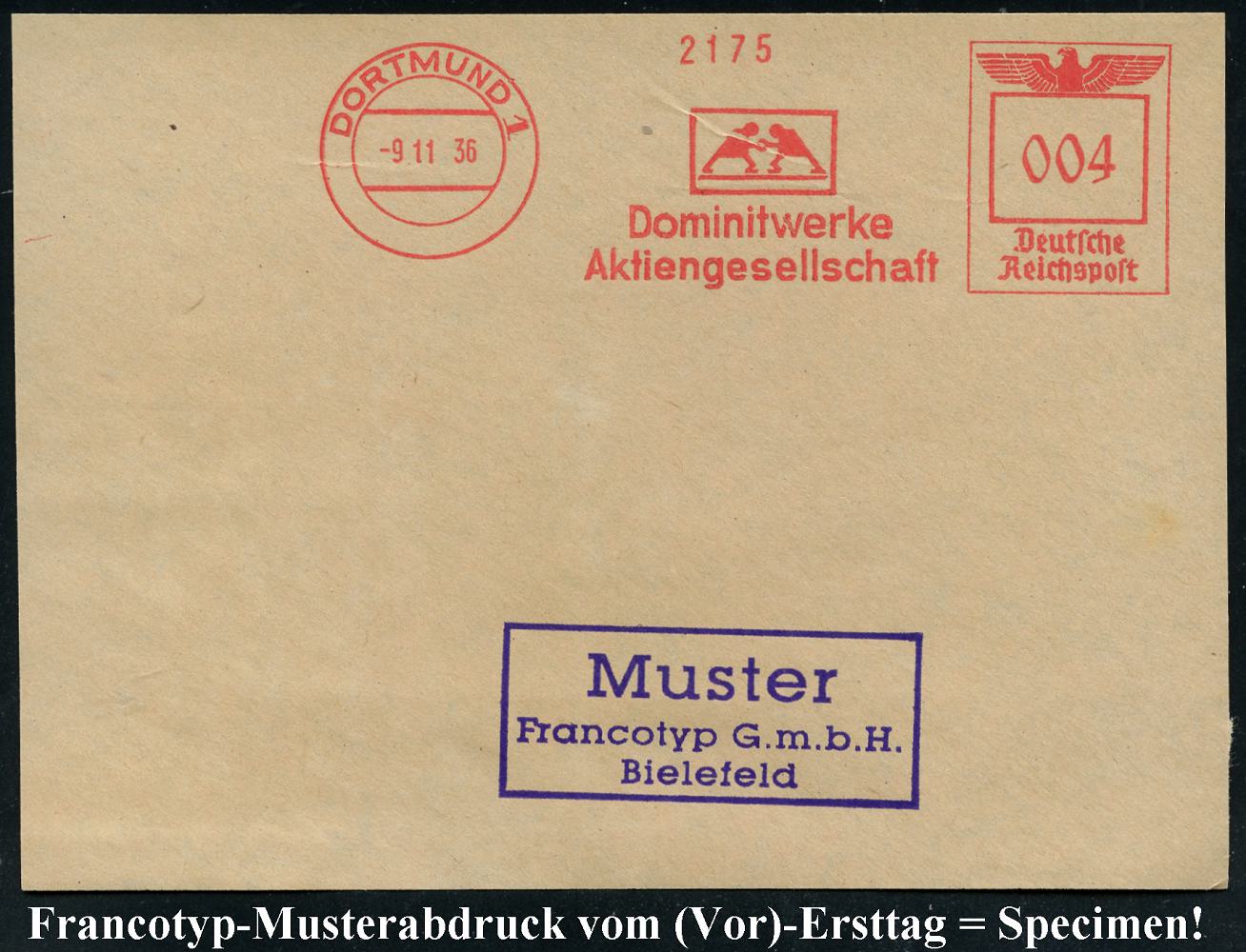 8011 | 35 € | 4600 Dortmund Absender-Freistempel : DORTMUND 1/ Dominitwerke/ AG 1936 (9.11.) AFS-Musterabdruck Francotyp "Reichsadler" (2 Comic-Figuren mit Schraubschlüssel-Gliedmaßen) glasklar gest. Francotyp-Musterblatt vom (Vor)-Ersttag !, selten! (Dü.E-5CEh) | ![]() ![]() | |