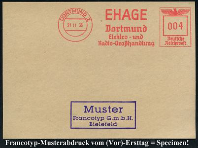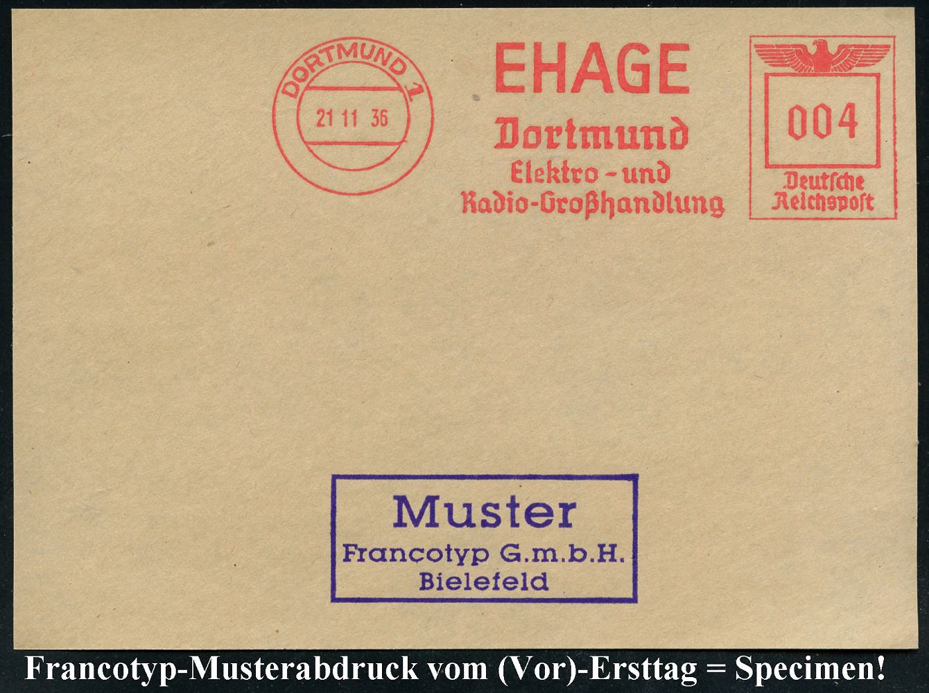 8013 | 35 € | 4600 Dortmund Absender-Freistempel : DORTMUND 1/ EHAG/ ..Elektro-u./ Radio-Großhandlung 1936 (21.11.) AFS-Musterabdruck Francotyp "Reichsadler" , glasklar gest. Francotyp-Musterblatt vom (Vor)-Ersttag !, selten! (Dü.E-5CGo) | ![]() ![]() | |