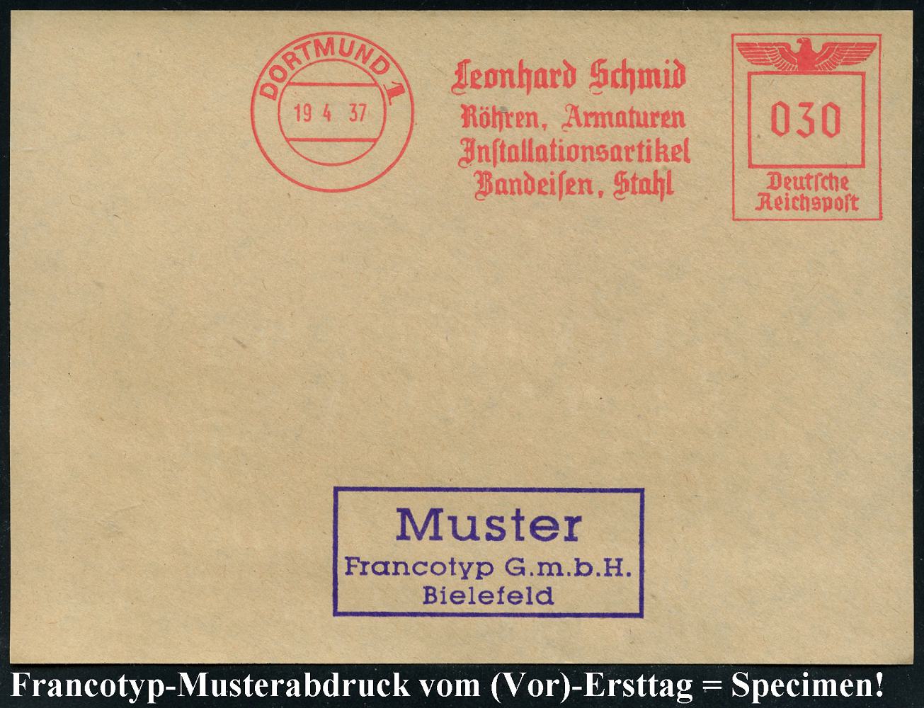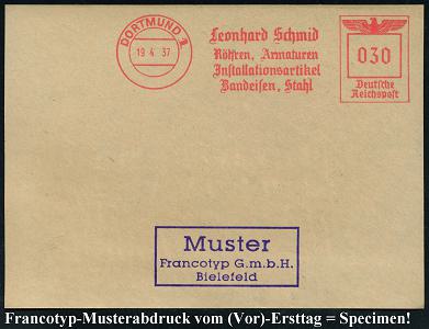 8017 | 35 € | 4600 Dortmund Absender-Freistempel : DORTMUND 1/ Leonhard Schmid/ Röhren,Armaturen/ Jnstallationsartikel/ Bandeisen,Stahl 1937 (19.4.) AFS-Musterabdruck Francotyp "Reichsadler" , glasklar gest. Francotyp-Musterblatt vom (Vor)-Ersttag !, selten! (Dü.E-5CGo) | ![]() ![]() | |