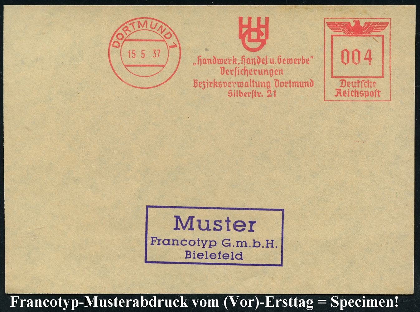8019 | 35 € | 4600 Dortmund Absender-Freistempel : DORTMUND 1/ HHG/ "Handwerk,Handel u.Gewerbe"/ Versicherungen/ Bezirksverwaltung.. 1937 (15.5.) AFS-Musterabdruck Francotyp "Reichsadler" (Monogr.-Logo) glasklar gest. Francotyp-Musterblatt vom (Vor)-Ersttag !, selten! (Dü.E-5CGo) | ![]() ![]() | |