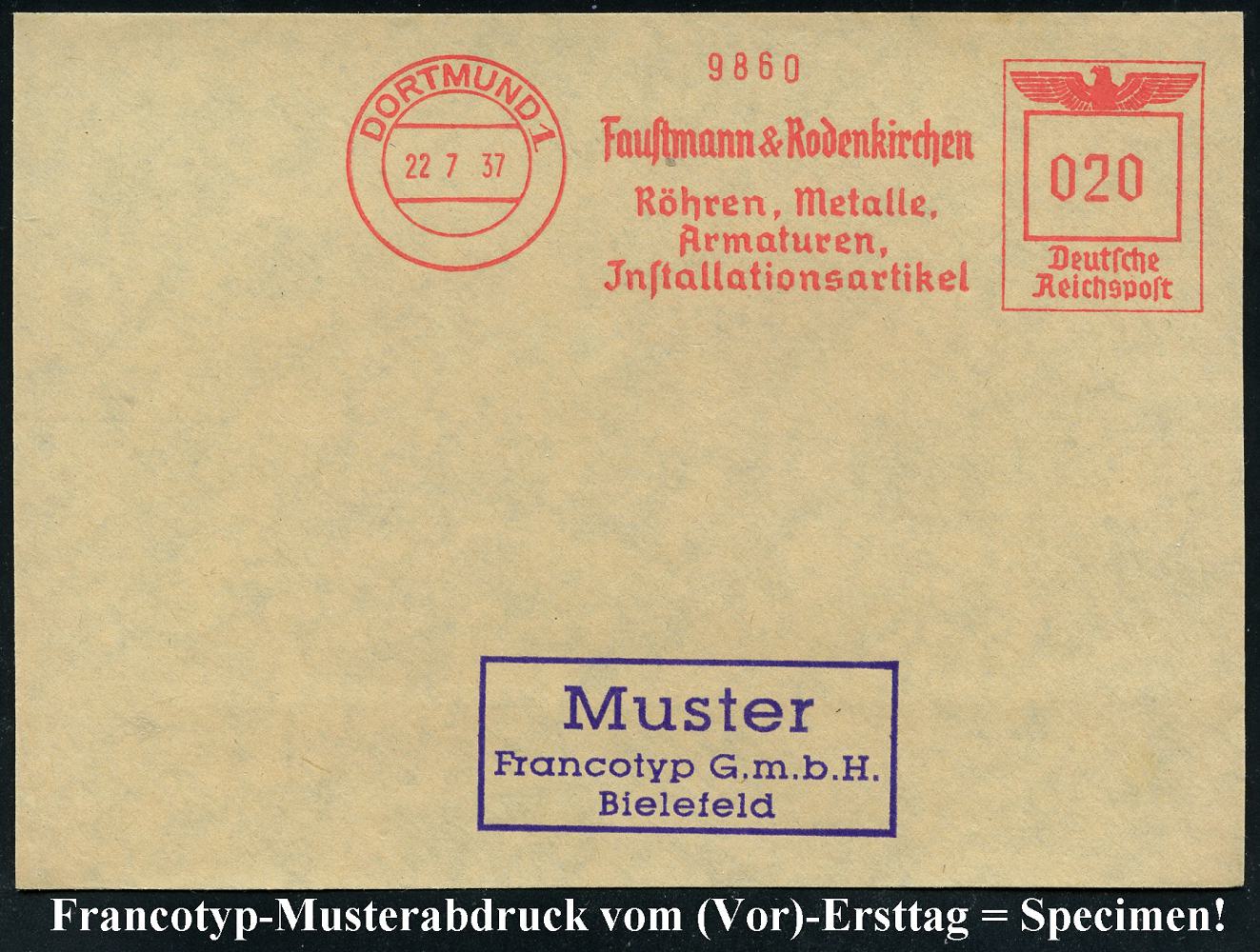 8021 | 35 € | 4600 Dortmund Absender-Freistempel : DORTMUND 1/ Faustmann & Rodenkirchen/ Röhren,Metalle/ Armaturen,/ Jnstallationsartikel 1937 (22.7.) AFS-Musterabdruck Francotyp "Reichsadler" , glasklar gest. Francotyp-Musterblatt vom (Vor)-Ersttag !, selten! (Dü.E-5CGh) | ![]() ![]() | |