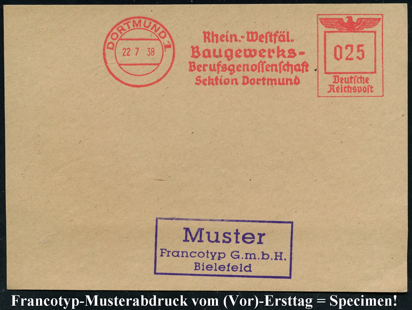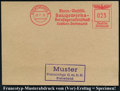 8029 | 35 € | 4600 Dortmund Absender-Freistempel : DORTMUND 1/ Rhein.-Westfäl./ Baugewerks-/ Berufsgenossenschaft.. 1938 (22.7.) AFS-Musterabdruck Francotyp "Reichsadler" , glasklar gest. Francotyp-Musterblatt vom (Vor)-Ersttag !, selten! (Dü.E-5CGo) | ![]() ![]() | |