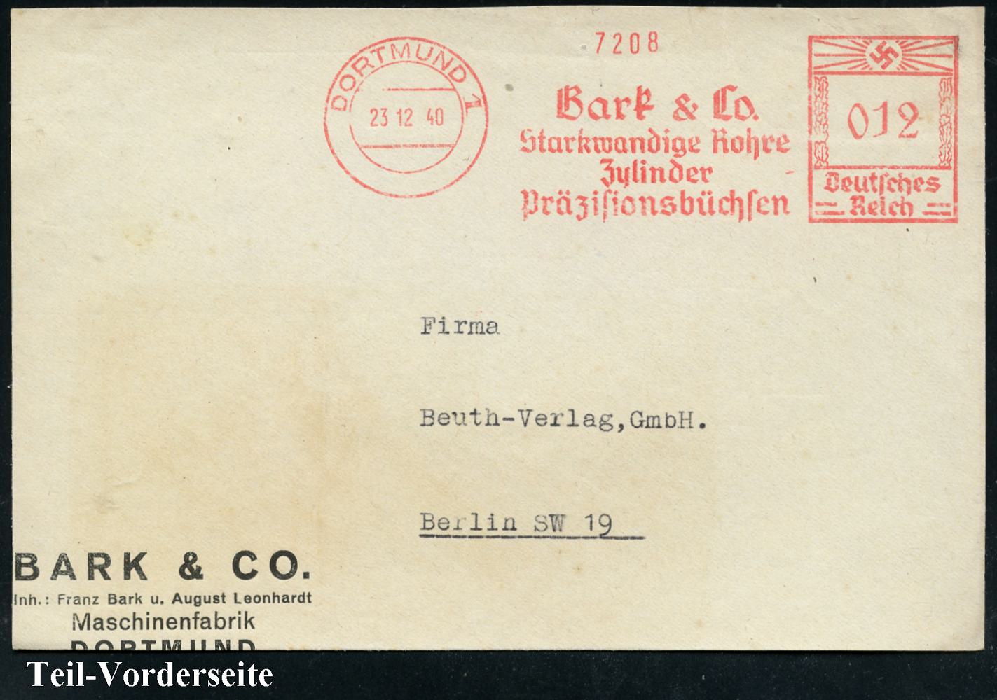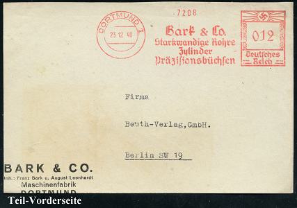 8038 | 15 € | 4600 Dortmund Absender-Freistempel : DORTMUND 1/ Bark & Co./ Starkwandige Rohre/ Zylinder/ Präzisionsbüchsen 1940 (23.12.) AFS Francotyp "Hakenkreuz" (= Maschinenfabrik) Firmen-Teil-Vorderseite (Dü.E-3CEh) | ![]() | |