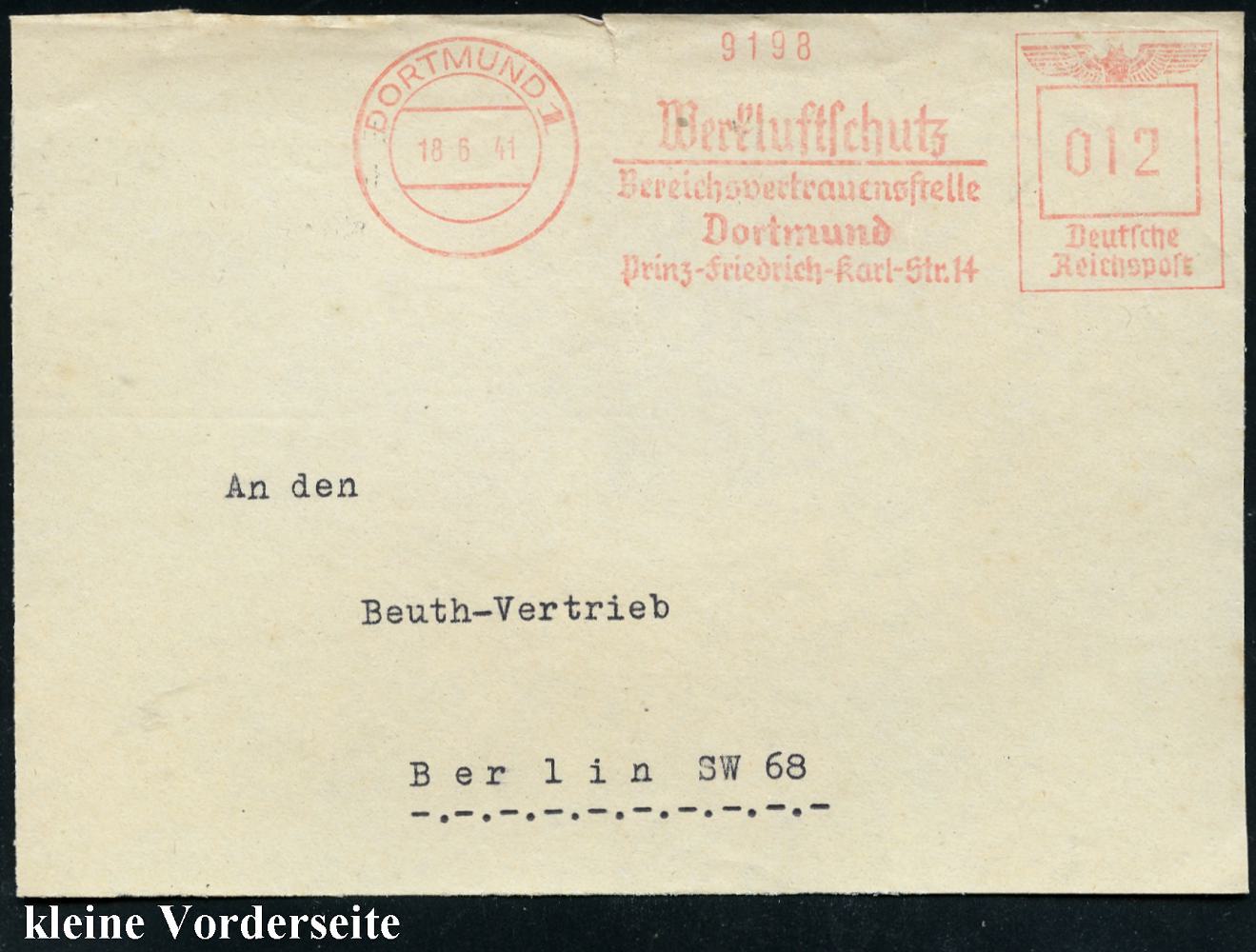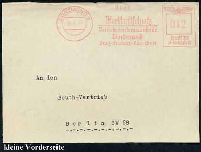 8039 | 16 € | 4600 Dortmund Absender-Freistempel : DORTMUND 1/ Werkluftschutz/ Bereichsvertrauenstelle.. 1941 (18.6.) seltener AFS Francotyp "Reichsadler" auf kleiner Bedarfs-Vorderseite (Dü.E-5CGh) | ![]() | |