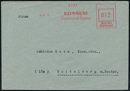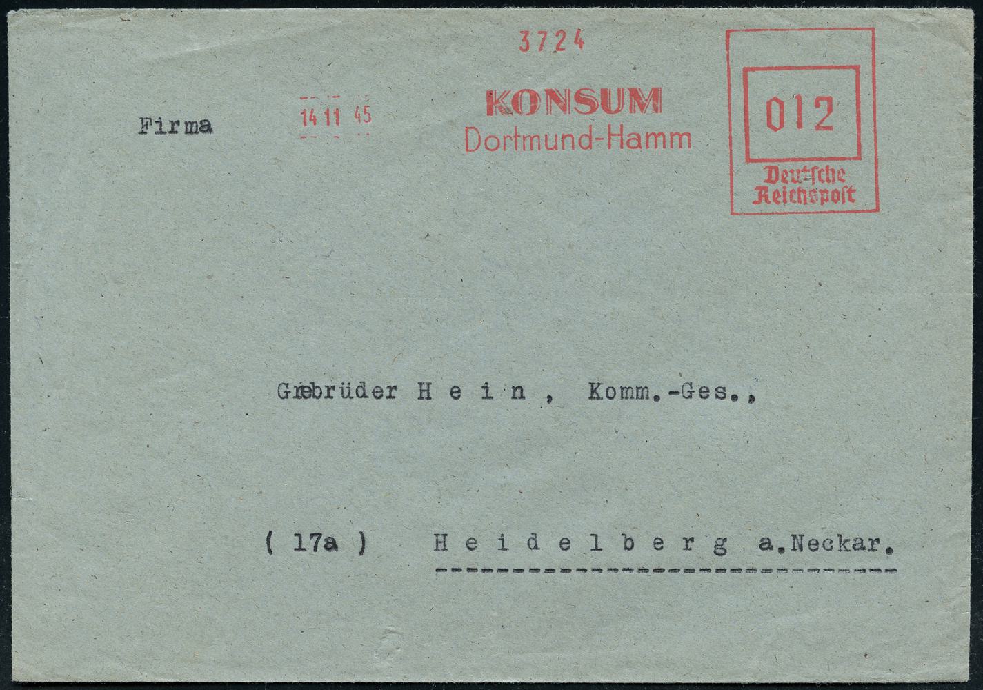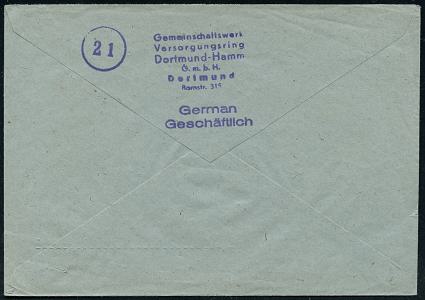 8042 | 40 € | 4600 Dortmund Absender-Freistempel : (Dortmund-Hamm)/ KONSUM/ Dortmund-Hamm 1945 (14.11.) aptieter AFS Francotyp "Reichsadler" = entfernt + Ortsstempel entfernt! = Notmaßnahme! , rs. Abs.-6L: Gemeinschaftswerk/Versorgungsring/Dortmund-Hamm.., sehr seltener Fern-Bf. (Dü.E-13 J-129h) | ![]() ![]() | |