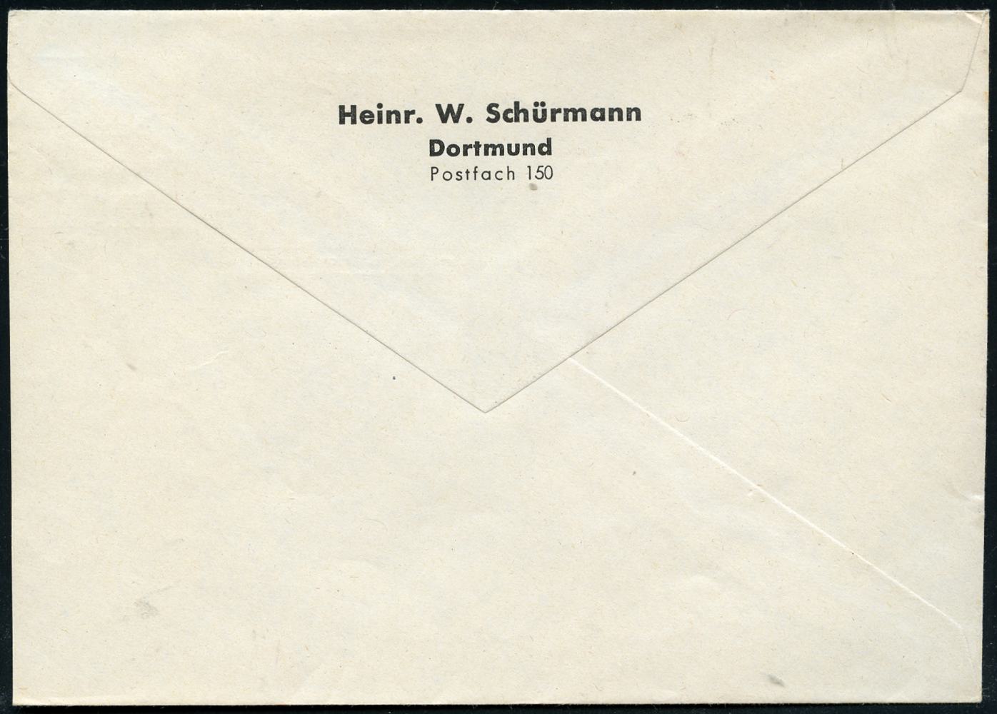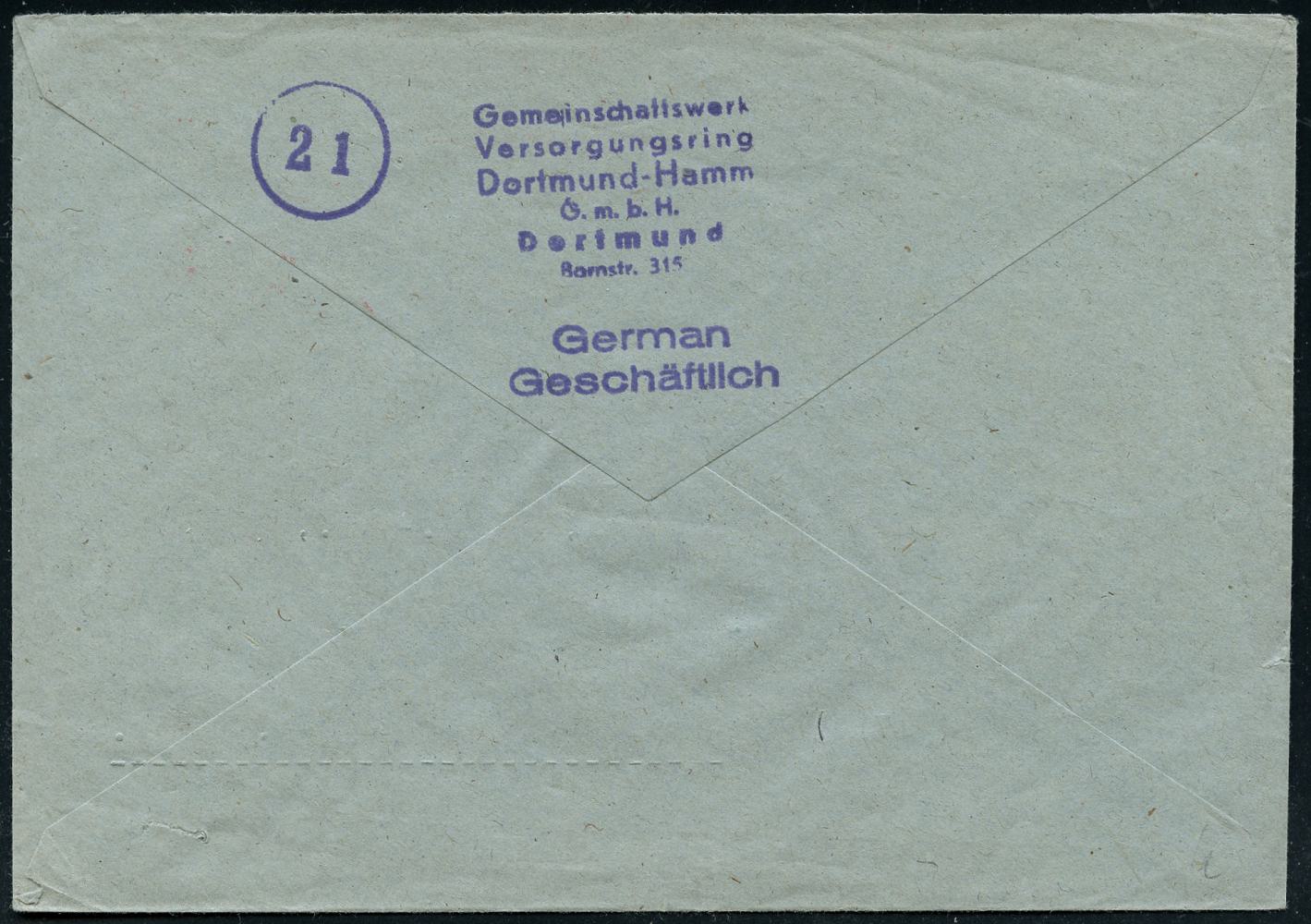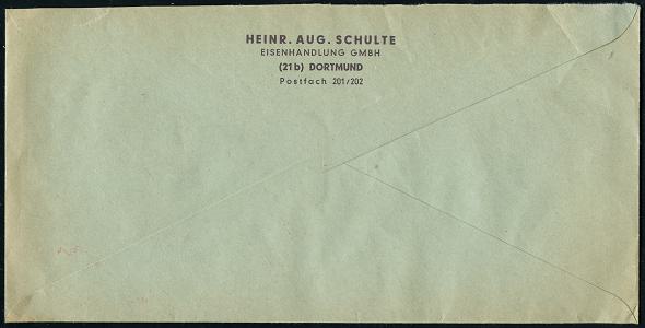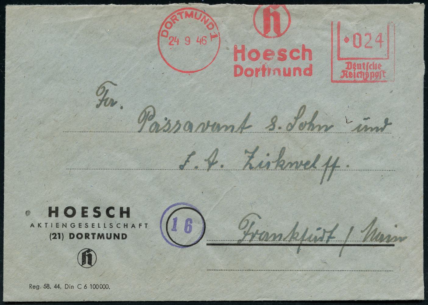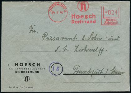 8050 | 25 € | 4600 Dortmund Absender-Freistempel : DORTMUND 1/ h/ Hoesch.. 1946 (24.9.) aptierter AFS Francotyp "Reichsadler" = entfernt = Notmaßnahme! (Monogr.-Logo) motivgl. Firmen-Fern-Bf. = Metall-Firma n. Ffm. (Dü.E-13 R-147o) | ![]() | |