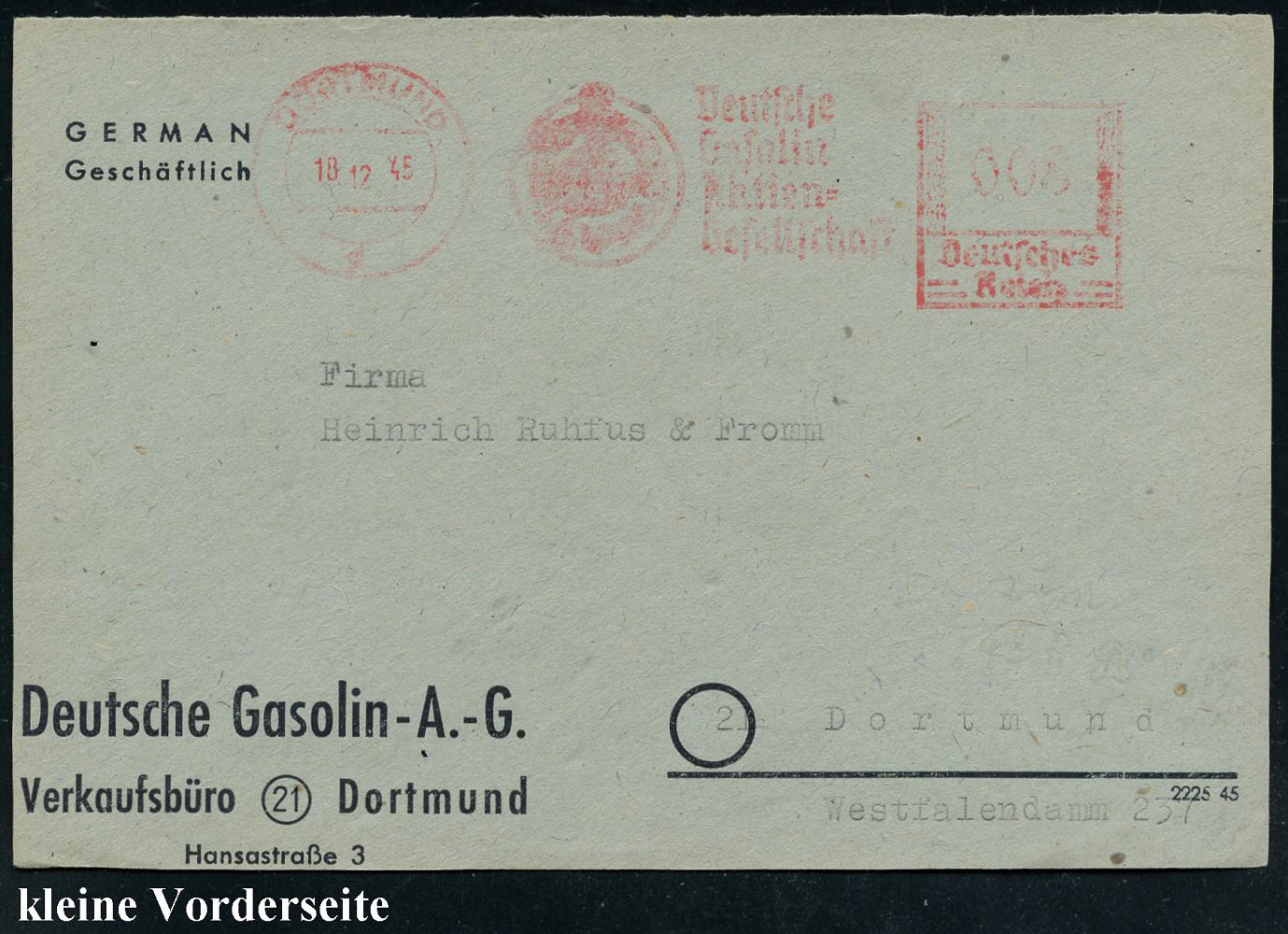 8043 | 20 € | 4600 Dortmund Absender-Freistempel : DORTMUND/ 1/ Deutsche/ Gasolin/ Aktien-/ Gesellschaft 1945 (10.12.) seltener, aptierter AFS Francotyp "Hakenkreuz" = entfernt = Notmaßnahme! (Maschine stark abgenutzt) noch altes IG-Farben-Logo!, die I.G.-Farben wurde von den Alliierten liquidiert!, kleine Firmen-Vorderseite: Deutsche Gasolin AG.. (Dü.E-12 M-98o = seltene Type!) | ![]() | |