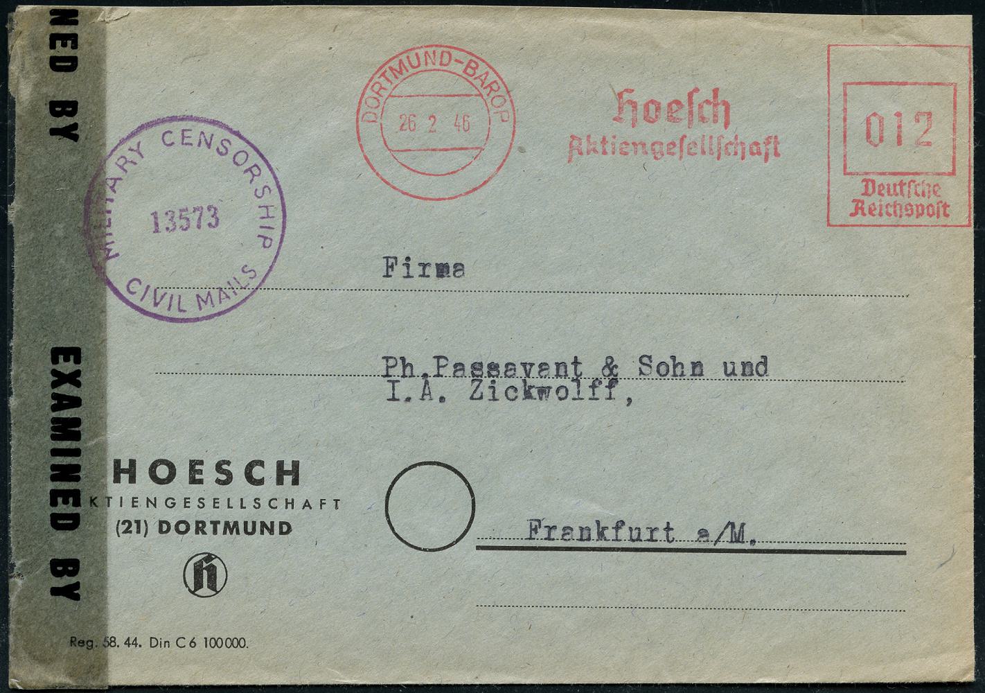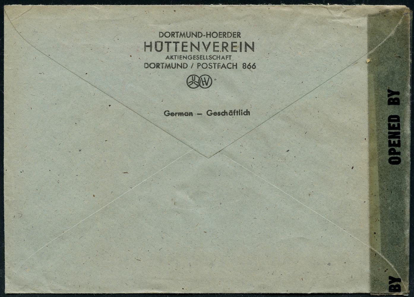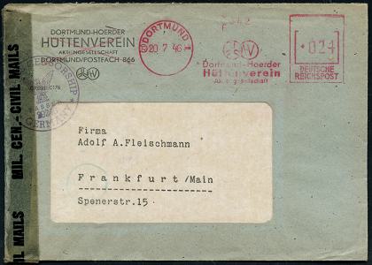 8048 | 30 € | 4600 Dortmund Absender-Freistempel : (21) DORTMUND 1/ HV/ Dortmund-Hoerder/ Hüttenverein/ AG 1946 (20.7.) aptierter AFS Francotyp Antiqua "Reichsadler" = entfernt = Notmaßnahme! (Monogr.-Logo) + US-Zensur-1K: U.S. CIVIL CENSORSHIP/ PAASED/20246/ GERMANY + Zensurstreifen: OPENED BY/ MIL CEN.-CIVIL MAILS (= Offenbach, Rie.A-2, A-101) Inl.-Zensur-Bf. (Dü.E-14 C-CGh = seltene Type) | ![]() ![]() | |