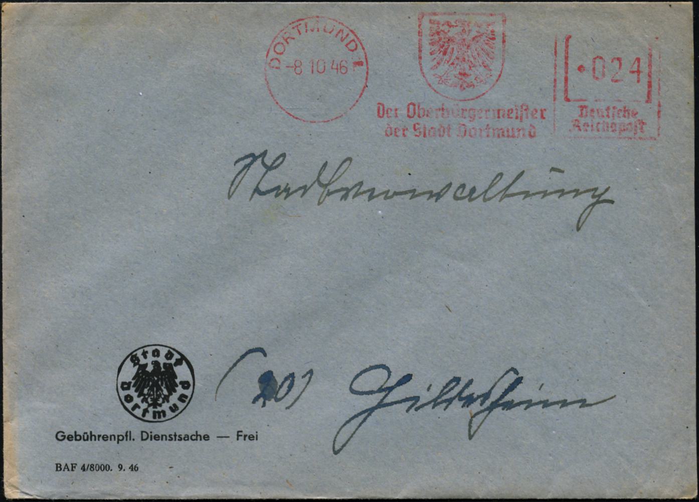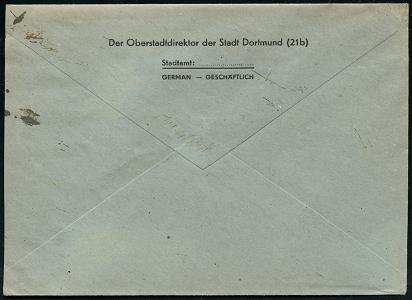 8051 | 20 € | 4600 Dortmund Absender-Freistempel : DORTMUND 1/ Der Oberbürgermeister.. 1946 (8.10.) aptierter AFS Francotyp "Reichsadler" = entfernt = Notmaßnahme! (Stadtwappen) motivgl. Kommunal-Bf., rs. Abs.-Vordruck: Der Oberstadtdirektor.. n. Hildesheim (Dü.E-13 R-147o) | ![]() ![]() | |