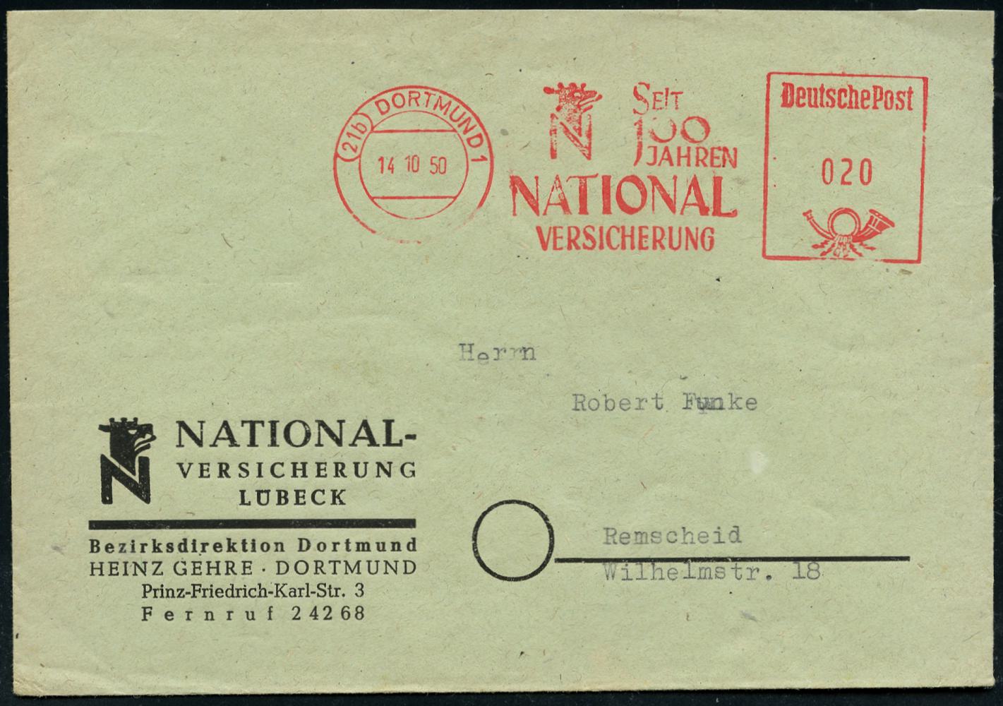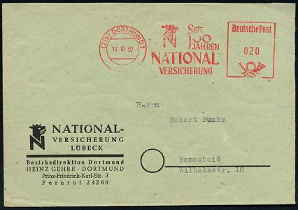 8053 | 18 € | 4600 Dortmund Absender-Freistempel : (21b) DORTMUND 1/ Seit/ 100 JAHREN/ NATIONAL/ VERSICHERUNG 1950 (14.10.) AFS Postalia "Posthorn" (Monogr.-Logo) motivgl. Firmen-Bf.: NATIONAL-VERSICHERUNG LÜBECK.. (Dü.E-20 B) | ![]() ![]() | |