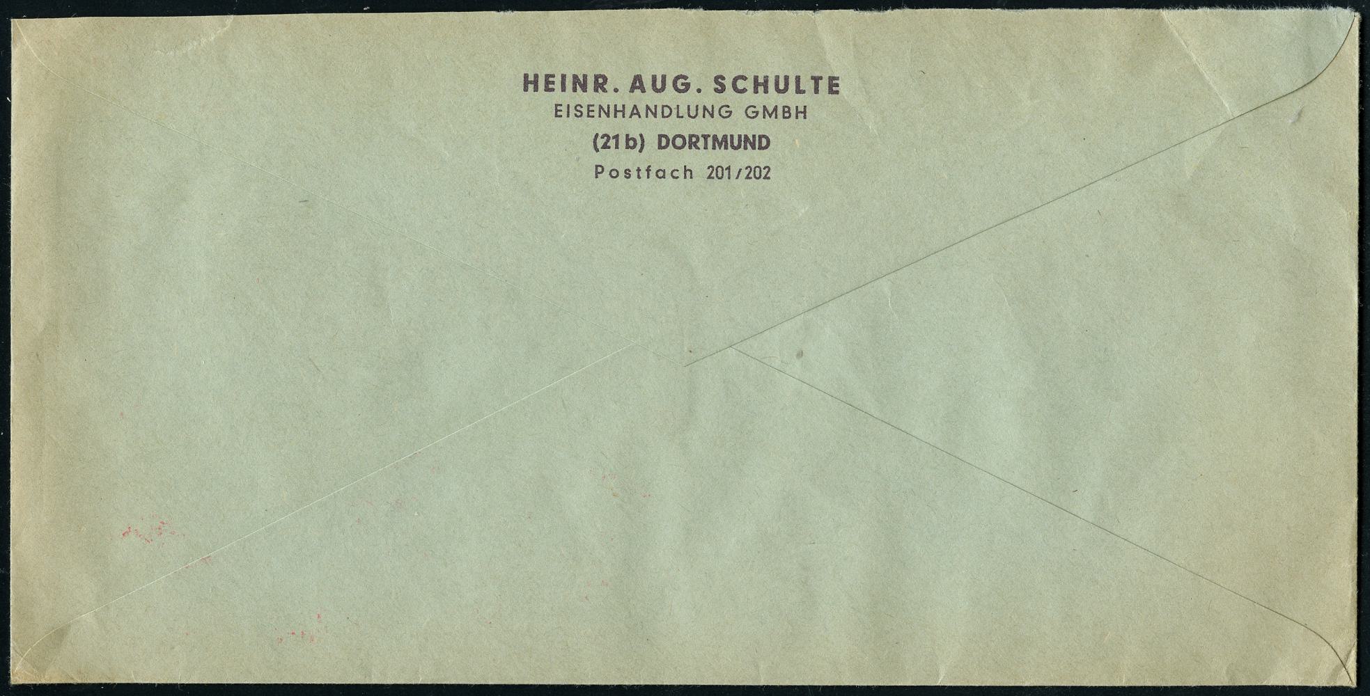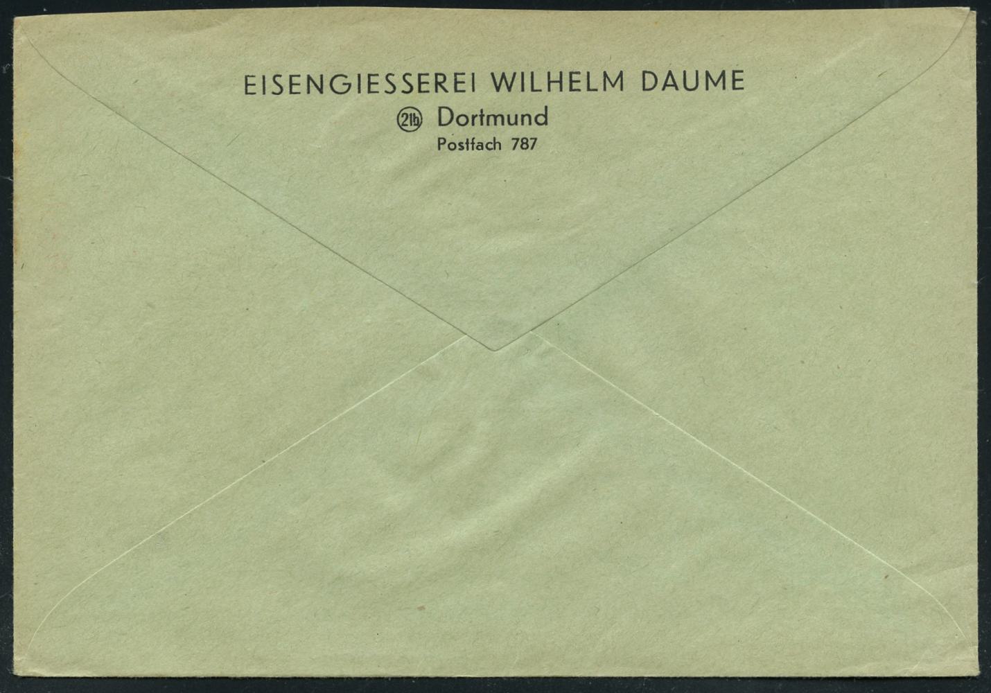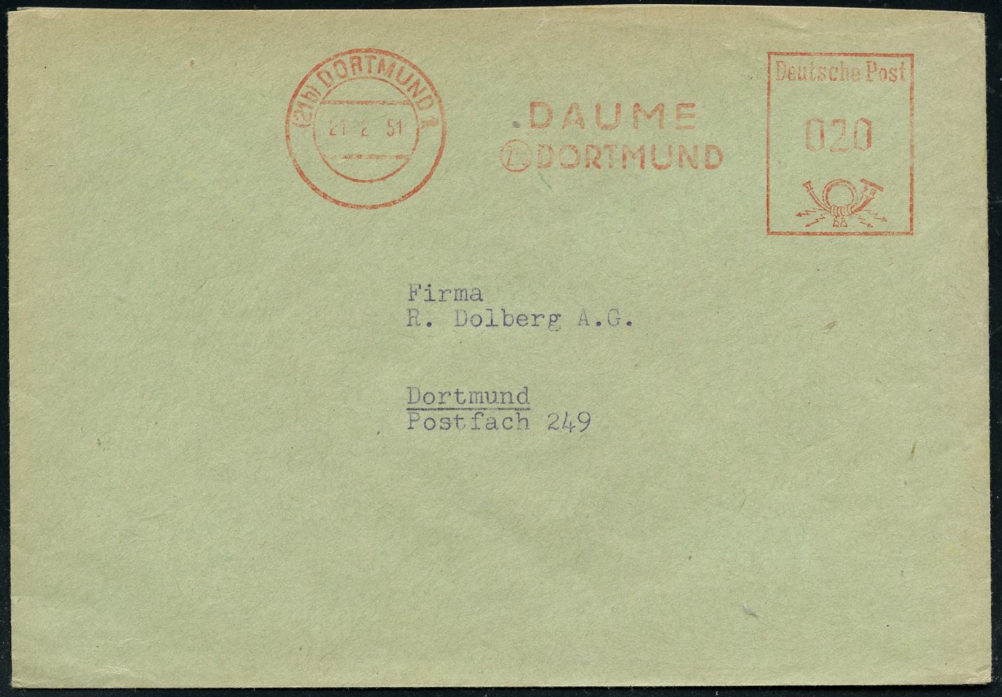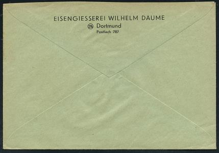 8054 | 14 € | 4600 Dortmund Absender-Freistempel : (21b) DORTMUND 1/ DAUME.. 1951 (21.2.) AFS Francotyp "Posthorn" , rs. Abs.-Vordruck: EISENGIESSEREI WILHELM DAUME, Orts-Bf. (Dü.E-20CGo) | ![]() ![]() | |