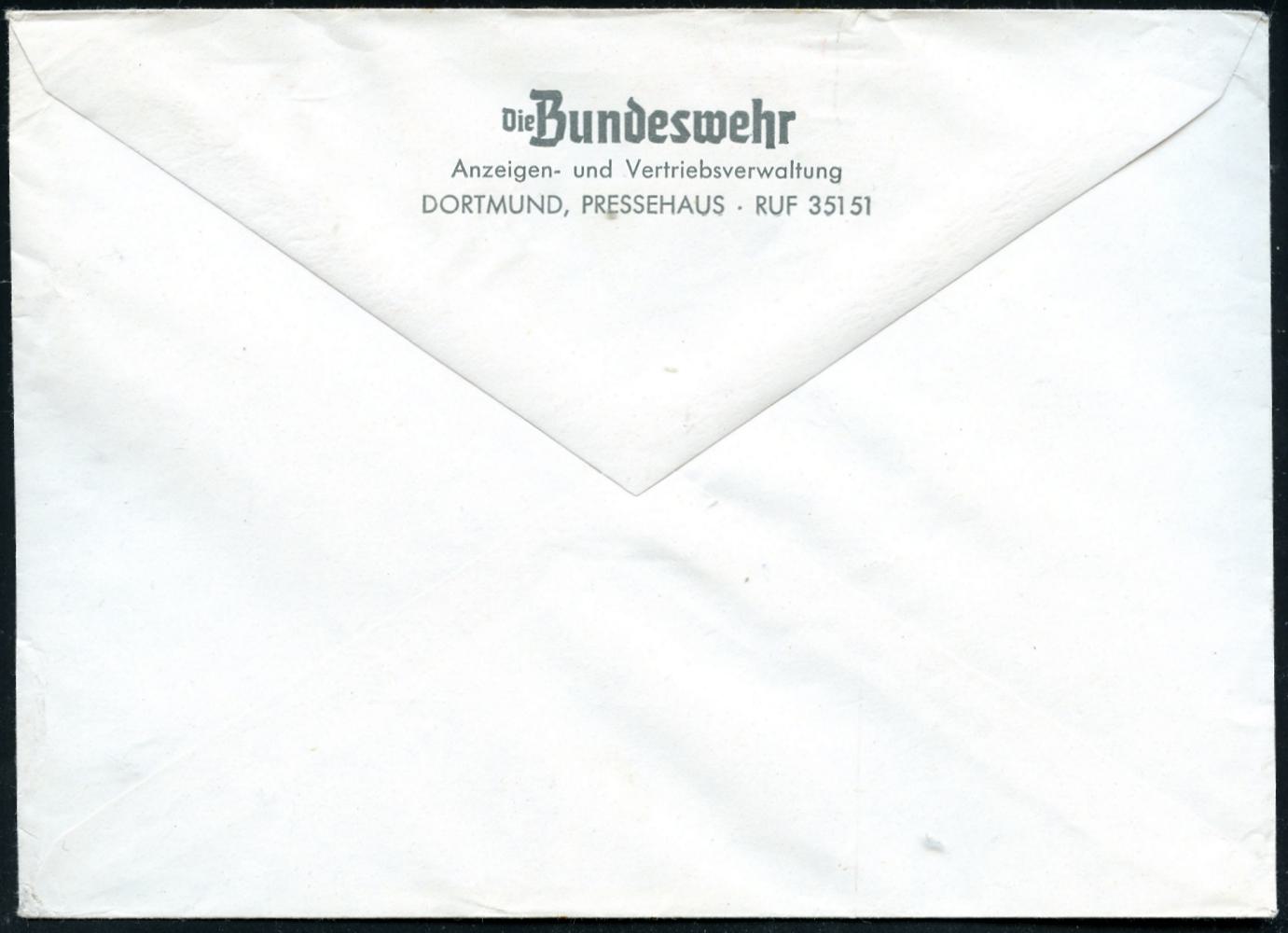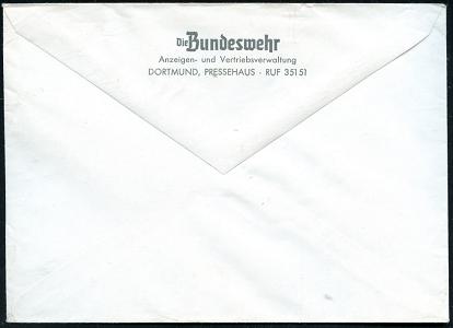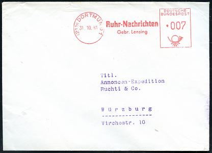 8061 | 14 € | 4600 Dortmund Absender-Freistempel : (21b) DORTMUND 1/ Ruhr.Nachrichten/ Gebr.Lensing 1961 (31.10.) AFS Francotyp , rs. Abs.-Vordruck: Die Bundeswehr, AAnzeigen- u. Vertriebsverwaltung, DORTMUND PRESSEHAUS.., Fern-Bf. (Dü.E-23DO mit Raute) | ![]() ![]() | |