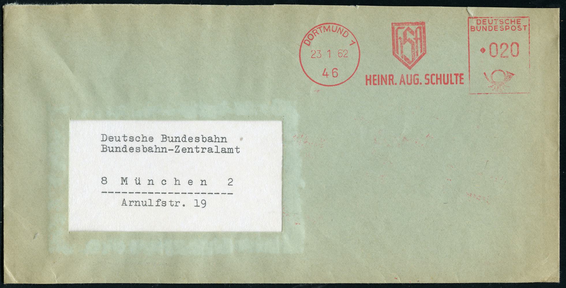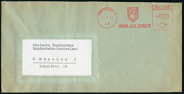 8062 | 16 € | 4600 Dortmund Absender-Freistempel : 46 DORTMUND 1/ HEINR.AUG.SCHULTE 1962 (23.1.) AFS Francotyp mit Sonderform, kleiner 1K-Stpl. mit kleiner PLZ (Monogr.-Logo) rs. Abs.-Vordruck (Eisenhandlung), Fern-Bf. (Dü.E-23DO, Sonderform Orts-Stpl.!) | ![]() ![]() | |