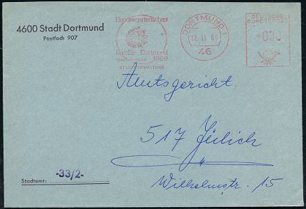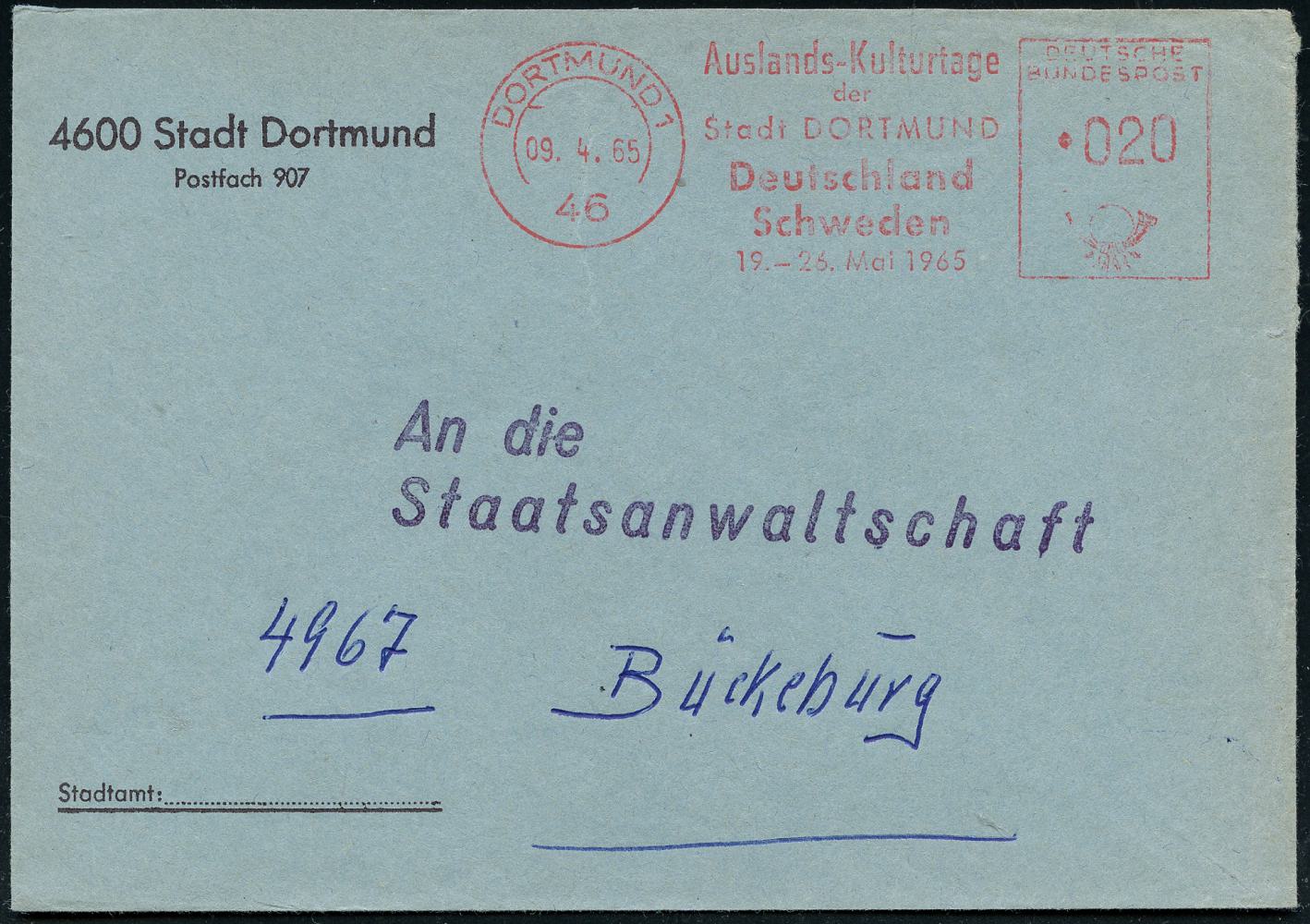 8065 | 15 € | 4600 Dortmund Absender-Freistempel : 46 DORTMUND 1/ Auslands-Kulturtage/ ..Deutschland/ Schweden/ 19.-26.Mai 1965 (9.4.) seltener AFS Francotyp auf Kommunalbf. (Dü.E-23DO nur kurze Verwendungszeit) | ![]() | |