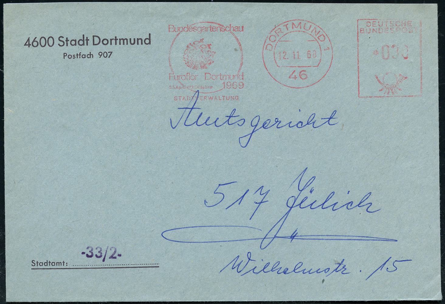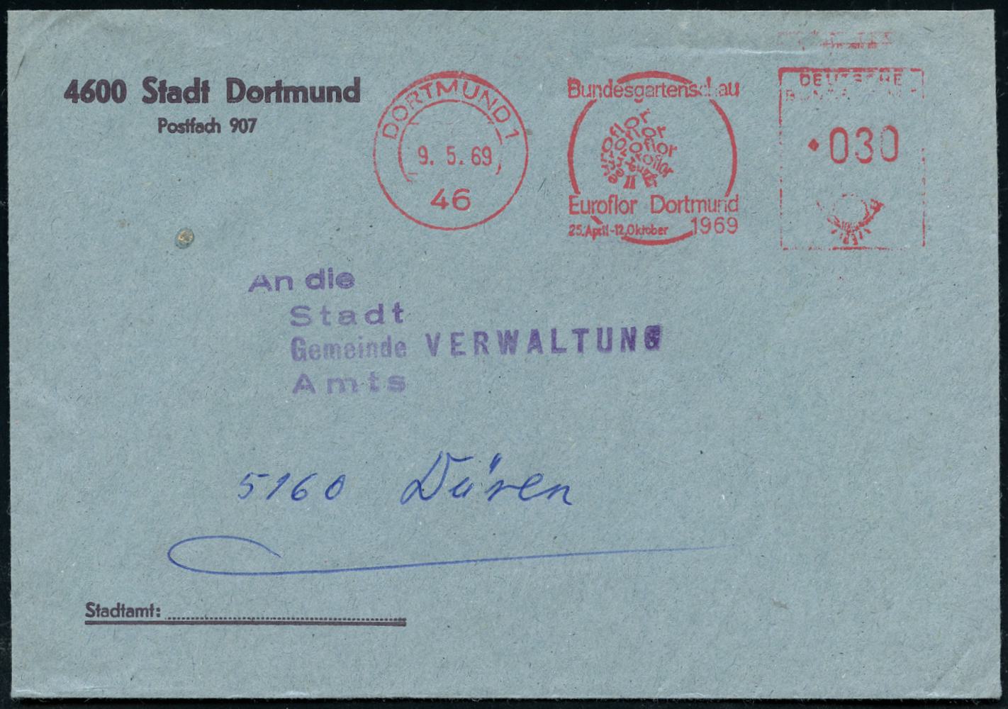 8068 | 20 € | 4600 Dortmund Absender-Freistempel : 46 DORTMUND 1/ Bundesgartenschau/ Euroflor.. 1968/69 2 verschied., kommunale AFS Francotyp (Blüten-Logo) je auf Kommunal-Bf. (Einzelverkauf möglich; je 12.- EUR) 2 Belege (Dü.E-23DO, E-26) | ![]() ![]() | |