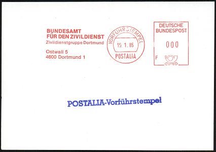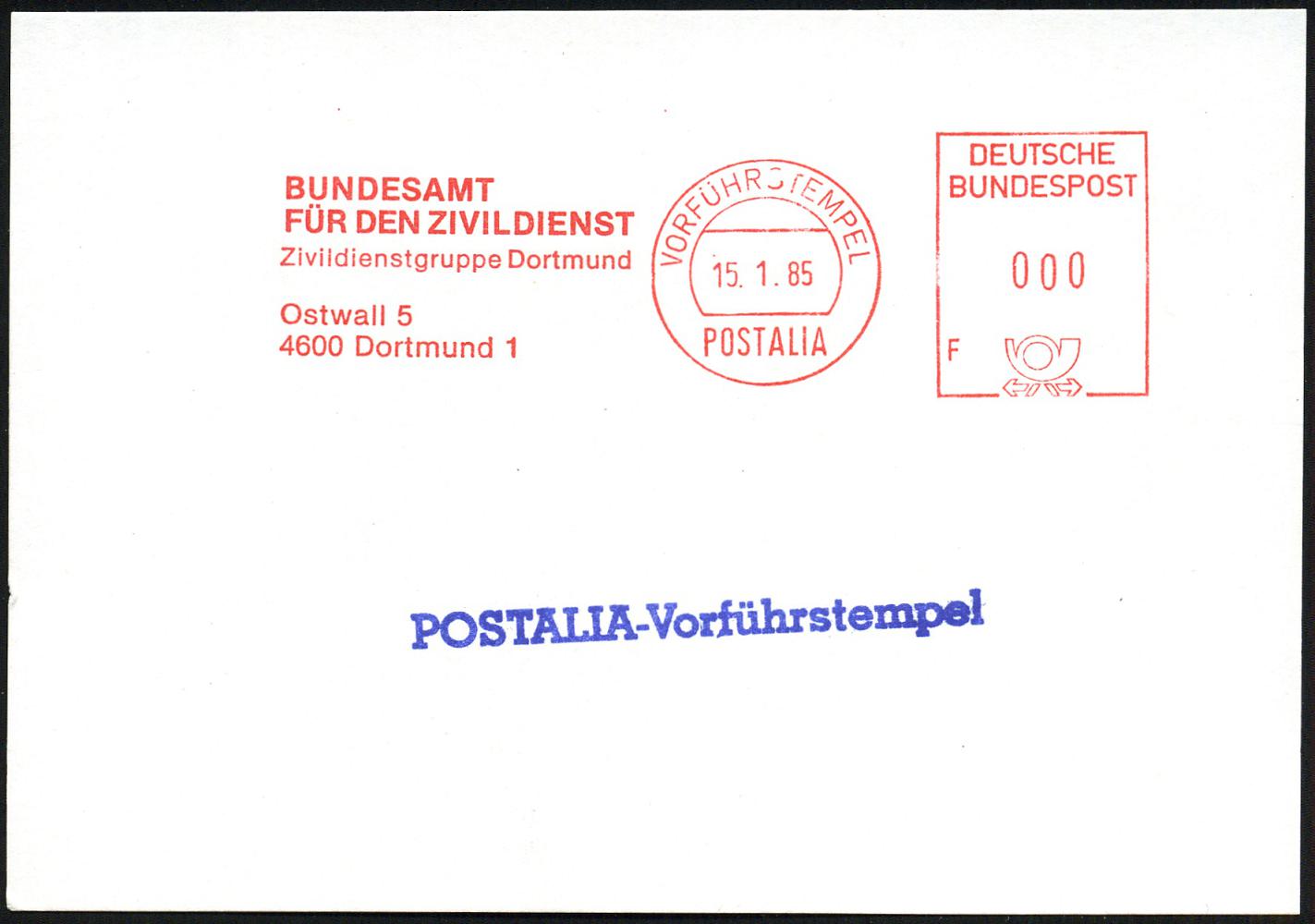 8070 | 15 € | 4600 Dortmund Absender-Freistempel : 4600 Dortmund 1 1985 (15.1.) AFS: VORFÜHRSTEMPEL/POSTALIA/ BUNDESAMT/ FÜR DEN ZIVILDIENST.. + 1L: Musterdruck, seltene Postalia-Musterkt.! | ![]() | |