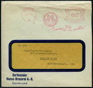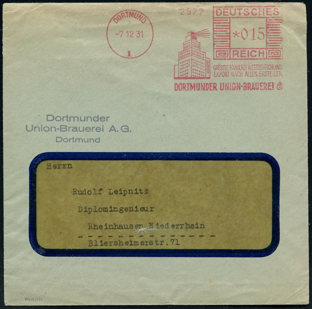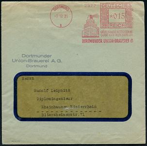 7999 | 25 € | 4600 Dortmund Absender-Freistempel : DORTMUND/ 1/ GRÖSSTE BRAUEREI WESTDEUTSCHLANDS/ ..DORTMUNDER UNION-BRAUEREI AG 1931 (7.12.) AFS Francotyp "Mäanderrechteck" (Hochhaus mit Scheinwerfer) klar gest. Firmen-Bf. (Dü.E-2Ah) | ![]() | |