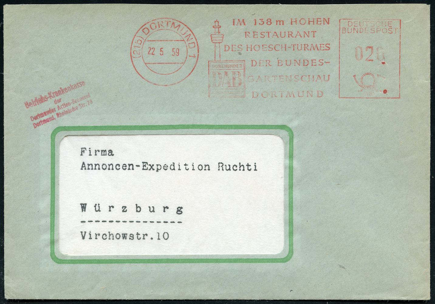 8060 | 18 € | 4600 Dortmund Absender-Freistempel : (21b) DORTMUND 1/ DAB/ ..IM 138m HOHEN/ RESTAURANT/ DES HOESCH-TURMES/ DER BUNDES-/ GARTEN-SCHAU.. 1959 (22.5.) seltener AFS Francotyp (DAB-Logo, Fernsehturm) Fern-Bf. (Dü.E-23CG) | ![]() | |