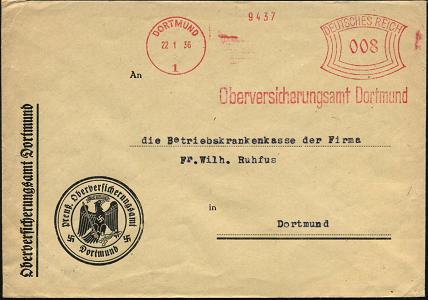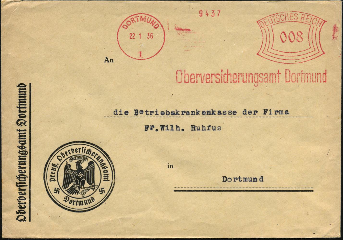 8007 | 28 € | 4600 Dortmund Absender-Freistempel : DORTMUND/ 1/ Oberversicherungsamt Dortmund 1936 (22.1.) AFS Francotyp "Bogenrechteck" 008 Pf. auf Dienst-Bf.: Preuß. Oberversicherungsamt.. (preuss. Adler "Gott mit uns!" mit Hakenkreuz) Ortsbf., diese Behörde war am Verlust des Versicherungsschutzes von jüdischen Bürgern beteiligt ! (Dü.E-1CEh) | ![]() | |