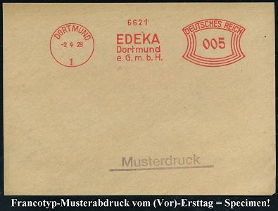 7995 | 35 € | 4600 Dortmund Absender-Freistempel : DORTMUND/ 1/ EDEKA/ Dortmund/ e.G.m.b.H. 1929 (2.4.) AFS-Musterabdruck Francotyp "Bogenrechteck" , glasklar gest. Francotyp-Musterblatt vom (Vor)-Ersttag !, selten! (Dü.E-1CBh = frühe C-Maschine!) | ![]() ![]() | |