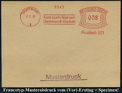 7997 | 35 € | 4600 Dortmund Absender-Freistempel : DORTMUND/ 1/ Konsum-Verein/ Dortmund-Hamm/ Postfach 321 1930 (17.2.) AFS-Musterabdruck Francotyp "Bogenrechteck" , glasklar gest. Francotyp-Musterblatt vom (Vor)-Ersttag !, selten! (Dü.E-1CEh) | ![]() ![]() | |
