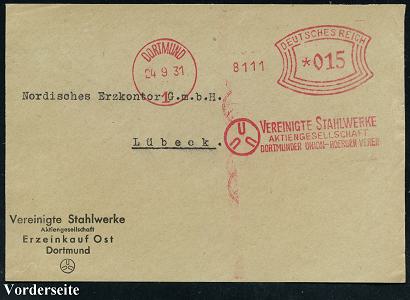 7998 | 25 € | 4600 Dortmund Absender-Freistempel : DORTMUND/ 1/ VEREINIGTE STAHLWERKE/ AG.. 1931/32 2 verschiedene AFS Francotyp "Bogenrechteck" (1x Firmen-Logo) kleine Firmen-Vorderseite bzw. Teil-Vorderseite, 2 Belege (Dü.E-1Am) | ![]() ![]() | |