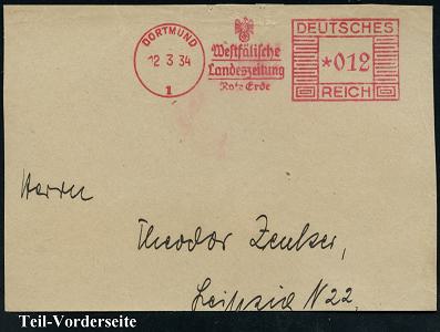 8003 | 15 € | 4600 Dortmund Absender-Freistempel : DORTMUND/ 1/ Westfälische/ Landeszeitung/ Rote Erde 1934 (12.3.) AFS Francotyp "Mäanderrechteck" (Hakenkreuz-Adler) Teil-Vorderseite (kl. Randrißchen geschl.) klar gest.! (Dü.E-2Ao) | ![]() | |