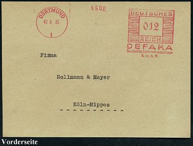 8006 | 14 € | 4600 Dortmund Absender-Freistempel : DORTMUND/ 1/ DEFAKA/ Deutsches Familien-Kaufhaus/ GmbH 1935 (2.6.) AFS Francotyp "Mäanderrechteck" auf Bedarfs-Vorderseite (Dü.E-2CEh) | ![]() | |