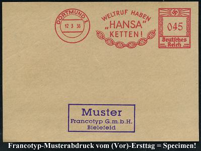 8009 | 35 € | 4600 Dortmund Absender-Freistempel : DORTMUND 1/ WELTRUF HABEN/ "HANSA"/ KETTEN 1936 (12.3.) AFS-Musterabdruck Francotyp "Hakenkreuz" (Kette) glasklar gest. Francotyp-Musterblatt vom (Vor)-Ersttag !, selten! (Dü.E-3CEh) | ![]() ![]() | |