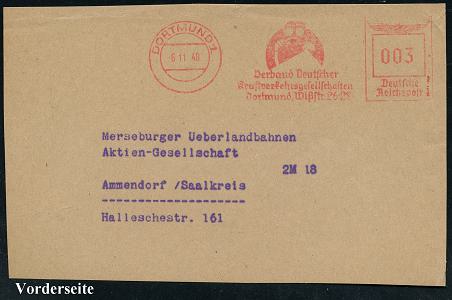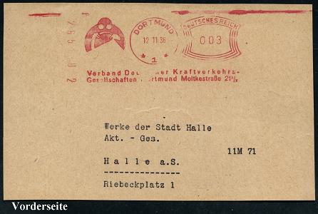 8037 | 16 € | 4600 Dortmund Absender-Freistempel : DORTMUND 1/ Verband Deutscher/ Kraftverkehrsgesellschaften.. 1940 (5.11.) AFS Francotyp "Reichsadler" (Kraftfahrer mit Schutzbrille) Bedarfs-Vorderseite, vergl. Kat.-Nr.8012 ! (Dü.E-5CGo) | ![]() | |