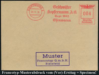 8014 | 35 € | 4600 Dortmund Absender-Freistempel : DORTMUND 1/ Geschwister/ Kopfermann A.-G./ Gegr.1842/ Eisenwaren 1936 (26.11.) AFS-Musterabdruck Francotyp "Reichsadler" , glasklar gest. Francotyp-Musterblatt vom (Vor)-Ersttag !, selten! (Dü.E-5CGo) | ![]() ![]() | |
