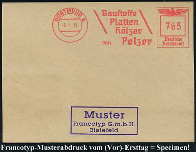 8015 | 35 € | 4600 Dortmund Absender-Freistempel : DORTMUND 1/ Baustoffe/ Platten/ Hölzer/ von Pelzer 1937 (5.1.) AFS-Musterabdruck Francotyp "Reichsadler" , glasklar gest. Francotyp-Musterblatt vom (Vor)-Ersttag !, selten! (Dü.E-5CGo) | ![]() ![]() | |