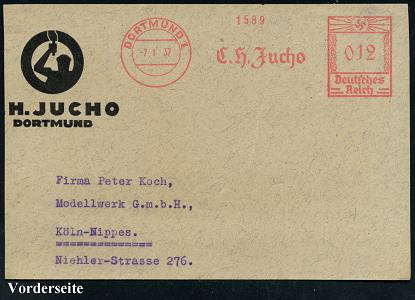 8016 | 14 € | 4600 Dortmund Absender-Freistempel : DORTMUND 1/ E.H.Jucho 1937 (7.1.) AFS Francotyp "Hakenkreuz" auf kleiner Firmen-Vorderseite mit Firmen-Logo (Dü.E-3CEh) | ![]() | |