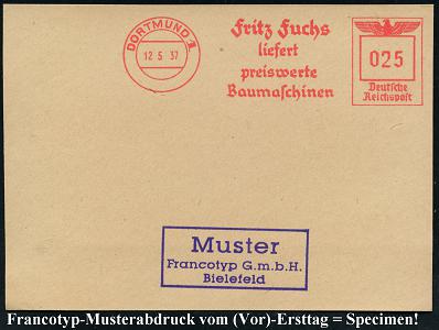 8018 | 35 € | 4600 Dortmund Absender-Freistempel : DORTMUND 1/ Fritz Fuchs/ liefert/ preiswerte/ Baumaschinen 1937 (12.5.) AFS-Musterabdruck Francotyp "Reichsadler" , glasklar gest. Francotyp-Musterblatt vom (Vor)-Ersttag !, selten! (Dü.E-5CGo) | ![]() ![]() | |