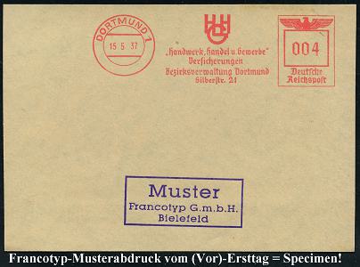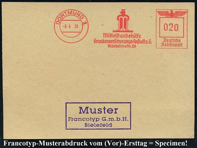 8028 | 35 € | 4600 Dortmund Absender-Freistempel : DORTMUND 1/ Mittelstandshilfe/ Krankenversicherungsanstalt a.G... 1938 (8.4.) AFS-Musterabdruck Francotyp "Reichsadler" (Monogr.-Logo mit Bär) glasklar gest. Francotyp-Musterblatt vom (Vor)-Ersttag !, selten! (Dü.E-5CGo) | ![]() ![]() | |