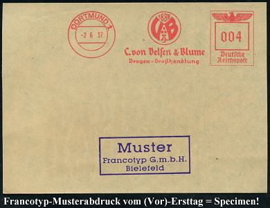 8020 | 35 € | 4600 Dortmund Absender-Freistempel : DORTMUND 1/ 1888/ V&B/ C.von Pelsen & Blume/ Drogen-Großhandlung 1937 (2.6.) AFS-Musterabdruck Francotyp "Reichsadler" (Monogr.-Logo) glasklar gest. Francotyp-Musterblatt vom (Vor)-Ersttag !, selten! (Dü.E-5CGo) | ![]() ![]() | |