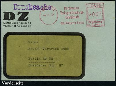 8022 | 12 € | 4600 Dortmund Absender-Freistempel : DORTMUND 1/ Dortmunder/ Verlags-u.Druckerei/ Gesellschaft/ Otto Fischer u.Söhne 1937 (4.11.) AFS Francotyp "Hakenkreuz" auf kleiner Bedarfs-Vorderseite: D Z, Dortmunder Zeitung.. (Dü.E-3Ao) | ![]() | |