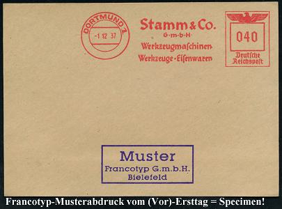 8023 | 35 € | 4600 Dortmund Absender-Freistempel : DORTMUND 1/ Stamm & Co./ GmbH/ Werkzeugmaschinen/ Werkzeuge-Eisenwaren 1937 (1.12.) AFS-Musterabdruck Francotyp "Reichsadler" , glasklar gest. Francotyp-Musterblatt vom (Vor)-Ersttag !, selten! (Dü.E-5CGo) | ![]() ![]() | |