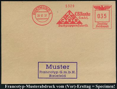 8024 | 35 € | 4600 Dortmund Absender-Freistempel : DORTMUND 1/ C.B.Ranke/ GmbH/ CBR/ Dachpappenfabrik 1937 (29.12.) AFS-Musterabdruck Francotyp "Reichsadler" (Monogr.-Logo mit Bergbauhämmern) glasklar gest. Francotyp-Musterabdruck vom (Vor9-Ersttag ! selten! (Dü.E-5CGh) | ![]() ![]() | |
