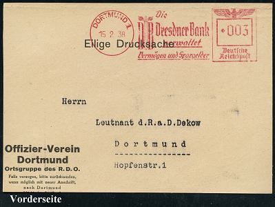 8025 | 14 € | 4600 Dortmund Absender-Freistempel : DORTMUND 1/ Die/ DB Dresdner Bank/ verwaltet/ Vermögen u.Spargelder 1938 (15.2.) AFS Francotyp "Reichsadler" auf kleiner Bedarfs-Vorderseite: Offizier-Verein Dortmund, Ortsgruppe des R.D.O.. (Dü.E-5DGo) | ![]() | |