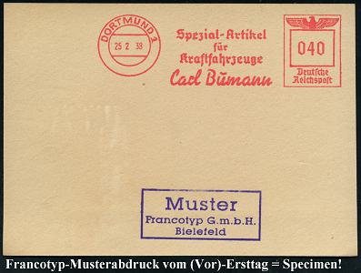 8026 | 35 € | 4600 Dortmund Absender-Freistempel : DORTMUND 1/ Spezial-Artikel/ für/ Kraftfahrzeuge/ Carl Bumann 1938 (25.2.) AFS-Musterabdruck Francotyp "Reichsadler" , glasklar gest. Francotyp-Musterblatt vom (Vor)-Ersttag !, selten! (Dü.E-5CGo) | ![]() ![]() | |