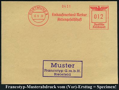 8030 | 35 € | 4600 Dortmund Absender-Freistempel : DORTMUND 1/ Einkaufsverband Merkur/ AG 1938 (13.9.) AFS-Musterabdruck Francotyp "Reichsadler" , glasklar gest. Francotyp-Musterblatt vom (Vor)-Ersttag !, selten! (Dü.E-5CGh) | ![]() ![]() | |