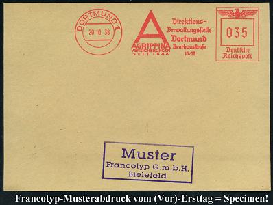 8031 | 35 € | 4600 Dortmund Absender-Freistempel : DORTMUND 1/ AGRIPPINA/ VERSICHERUNGEN/ SEIT 1844/ Direktions-/ Verwaltungsstelle.. 1938 (20.10.) AFS-Musterabdruck Francotyp "Reichsadler" (Monogr.-Logo) glasklar gest. Francotyp-Musterblatt vom (Vor)-Ersttag !, selten! (Dü.E-5CGo) | ![]() ![]() | |