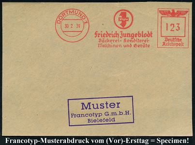 8032 | 35 € | 4600 Dortmund Absender-Freistempel : DORTMUND 1/ Friedrich Jungeblodt/ Bäckerei-Konditorei-/ Maschinen u.Geräte 1939 (30.2.) AFS-Musterabdruck Francotyp "Reichsadler" (Monogr.-Logo) glasklar gest. Francotyp-Musterblatt vom (Vor)--Ersttag !, selten! (Dü.E-5CGo) | ![]() ![]() | |
