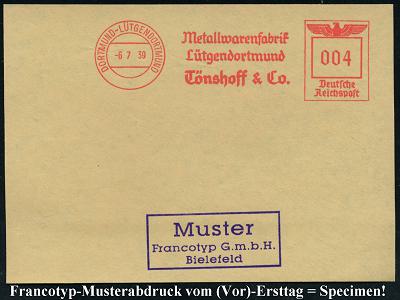 8033 | 35 € | 4600 Dortmund Absender-Freistempel : DORTMUND-LÜTGENDORTMUND/ Metallwarenfabrik/ Lütgendortmund/ Tönshoff & Co. 1939 (6.7.) AFS-Musterabdruck Francotyp "Reichsadler" , glasklar gest. Francotyp-Musterblatt vom (Vor)-Ersttag !, selten! (Dü.E-5CGo) | ![]() ![]() | |