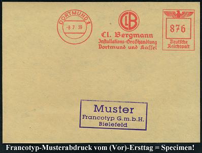 8034 | 35 € | 4600 Dortmund Absender-Freistempel : DORTMUND 1/ CLB/ Cl.Bergmann/ Jnstallations-Großhandlung/ Dortmund u.Kassel 1939 (8.7.) AFS-Musterabdruck Francotyp "Reichsadler" (Monogr.-Logo) glasklar gest. Francotyp-Musterblatt vom (Vor)-Ersttag !, selten! (Dü.E-5CGo) | ![]() ![]() | |
