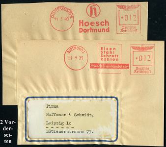 8035 | 22 € | 4600 Dortmund Absender-Freistempel : DORTMUND 1/ H/ Hoesch.. 1939/40 2 verschiedene AFS Francotyp "Reichsadler" = Fa. für Eisen, Stahl, Schrott etc., je kleine Bedarfs-Vorderseite, 2 Belege (Dü.E-5DG) | ![]() | |